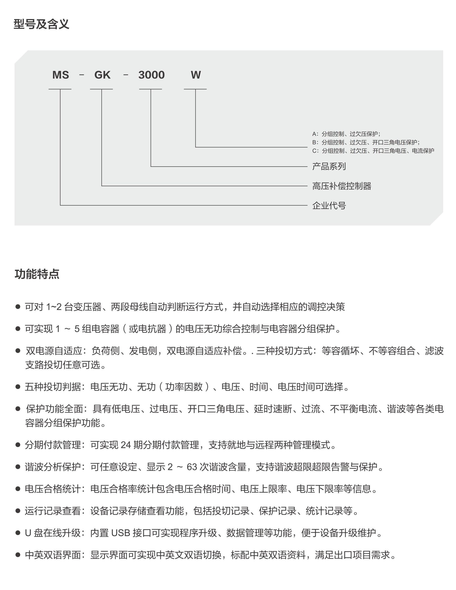 MS-GK 系列高壓無功補償控制器,采用控制與保護一體化設計,主要適用于 6 ~ 35KV 變 電 站,可滿足 1 ~ 2 臺主變、1 ~ 5 組電容器(或電抗器)的自動控制與保護需求,支持滿足負荷側(或發(fā)電側)對于感性(或容性)負載現(xiàn)場的無功補償需求。三種投切方式、五種投切判據(jù),支持分期付款管理、USB 在線升級、無功補償云管理。保護功能包括:過壓、欠壓、開口三角電壓、延時速斷、過流、不平衡電流、諧波等保護功能。