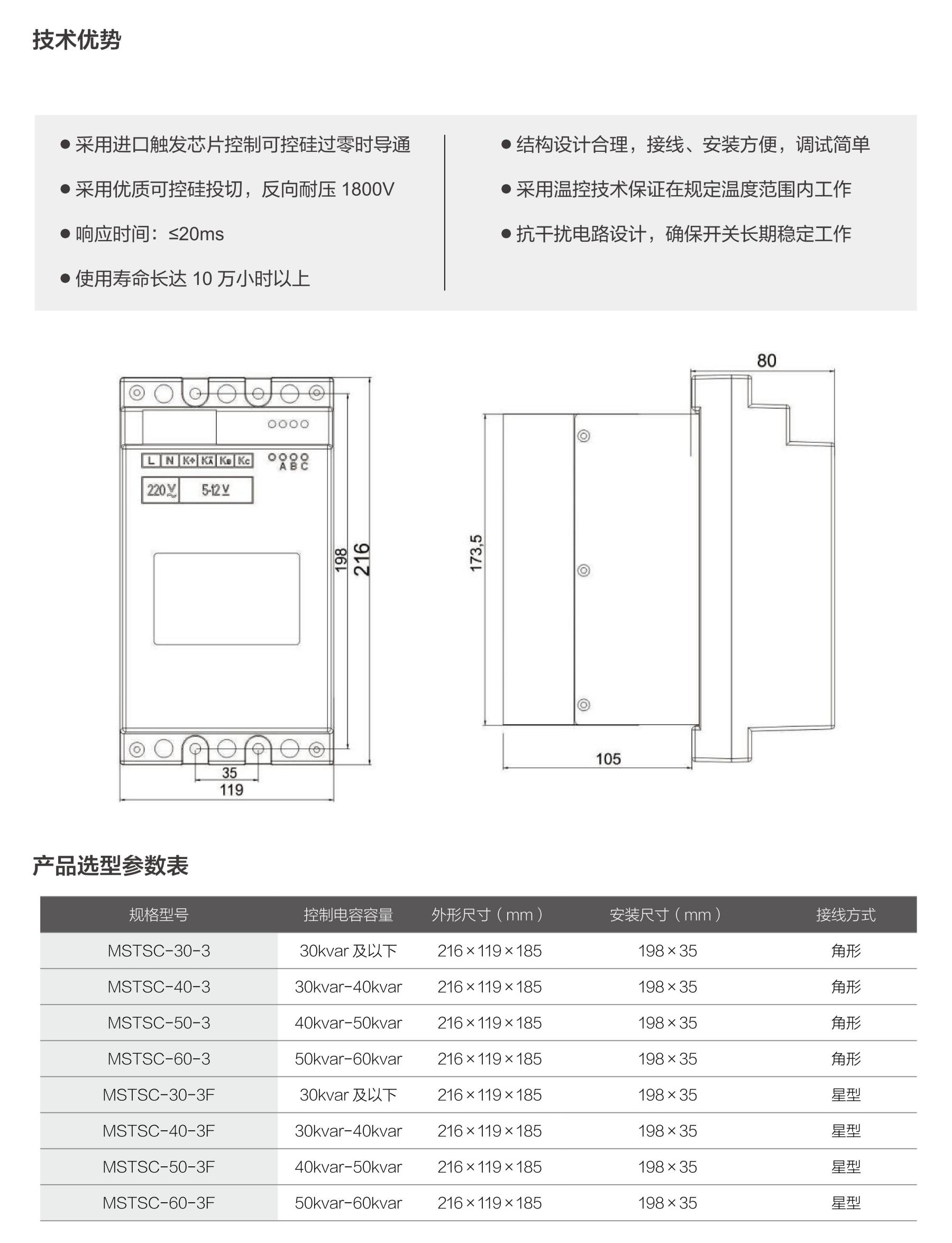 MSTSC 系列無(wú)觸點(diǎn)可控硅開(kāi)關(guān)是一種能夠?qū)﹄娏Σ⒙?lián)電容器進(jìn)行快速投切的電子型功率器件,主要由大功率反并聯(lián)晶閘管模塊、隔離電路、觸發(fā)電路、保護(hù)電路及散熱裝置等組成,用于低壓 400V 系統(tǒng)容性負(fù)載的通電控制,具有安裝簡(jiǎn)單、維護(hù)方便、響應(yīng)速度快、投切無(wú)涌流、工作無(wú)噪聲,是無(wú)功功率動(dòng)態(tài)補(bǔ)償裝置用于投切電容器組的理想器件。